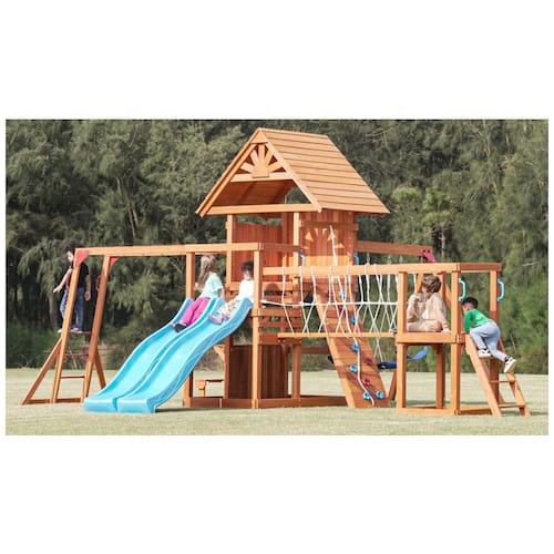 Madeira Cedro Premium: Fabricado com madeira de cedro de alta qualidade, o playground é resistente à água, corrosão e rachaduras, adequado para todas as condições climáticas. Antes de comprar, verifique se seu quintal acomoda o produto.