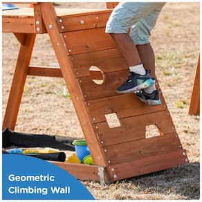 Design Único: A parede de escalada possui formato geométrico, trazendo um toque lúdico ao playground. O espaço sob a fortaleza pode ser utilizado como caixa de areia, proporcionando ainda mais diversão. Ideal para crianças de 2 a 6 anos, atendendo às suas necessidades básicas de brincadeira.