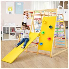 Este conjunto de brinquedos para crianças é um presente ideal para seus filhos e amigos. Com escorregador reversível, balanço de madeira, barras de macaco, argolas de ginástica, rede de escalada, escada de madeira, escada de corda e rocha de escalada, as crianças podem experimentar uma variedade de esportes neste parque infantil indoor.