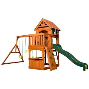A escada plana e a parede de pedra de 1,2 metros permitem que as crianças subam com facilidade ou enfrentem um pequeno desafio de escalada. Para mais emoção, o escorregador de 20 cm oferece uma descida rápida e segura, enquanto os 2 balanços de cinto e o trapézio garantem que até três crianças possam balançar ao mesmo tempo.