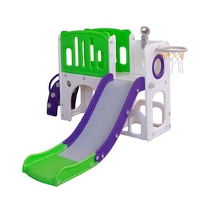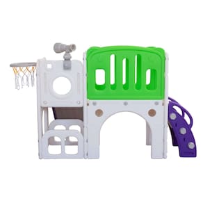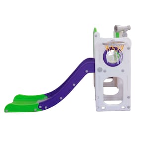 Com 2 torres que incluem escorregador, cesta de basquete, luneta e guarda-brinquedos.