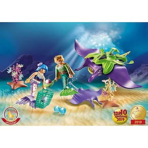 Os dois colecionadores de pérolas já estão procurando as preciosas contas de luz o dia todo. Somente através das contas luminosas a luz penetra na escuridão do mar. Lá nos corais estão dois espécimes particularmente brilhantes. Com cuidado a sereia pega a pérola com a concha e a coloca delicadamente na cesta de coleta. Até a noite, os dois têm que pesquisar mais. Felizmente, eles têm duas arraias fiéis como companhia. O playset contém duas figuras do mar Playmobil, duas raias de arraia, dois corais com contas, uma cesta de colecionador e outros extras. Figuras: 1 sereia, 1 tritão Animais: 1 raia com capa de algas, 1 raia bebê Acessórios: 1 rede coletora para contas, 1 folha de alga com cabo, 4 contas, 2 pulseiras, 1 flor de cabelo, 1 colar, 1 coroa, 1 capa , 2 plantas de coral