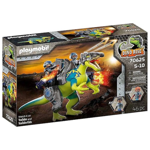 Descrição: Com seus dentes afiados, o Spinosaurus é um dos maiores e mais perigosos dinossauros. Mas este Spinosaurus não é um dinossauro comum, mas algo muito especial. Desde que foi libertado de Dino Rock, ele e seus amigos Samu e Ayla estão lutando lado a lado contra as pérfidas máquinas de combate que tentam destruir tudo.