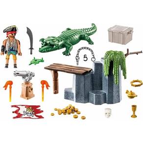 Durante a sua caça ao tesouro, um pirata encontra um crocodilo que se aproxima do cobiçado cofre do tesouro. Inclui uma caveira que brilha no escuro. Entre na caça ao tesouro com o pirata, mas tem cuidado: um crocodilo aproxima-se do precioso cofre ou está mais interessado no pirata? Os fantásticos Starter Packs da PLAYMOBIL convidam as crianças a mergulhar diretamente no variado mundo da PLAYMOBIL. Os sets incluem figuras e acessórios dos mundos populares da PLAYMOBIL, montam-se rapidamente e ficam imediatamente prontos para brincar.