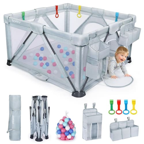 Por que escolher o OCATO Baby Playpen? 1. Fácil de montar: o cercadinho dobrável atualizado da OCATO, leva apenas alguns minutos para instalar e remover, dobra-se bem e é fácil de armazenar. Essa inovadora tecnologia de dobragem resolveu completamente o problema do difícil pátio de recreação para montagem de bebês. Com este cercadinho integrado para bebês e crianças pequenas, você pode fazer tudo sozinho! 2. Seguro e confiável: novo cercadinho atualizado para um melhor crescimento da criança. O cercadinho Baby Gate é feito de tecido Oxford 300D, seguro e fácil de limpar. O cercadinho infantil usa uma estrutura triangular de metal e uma base antiderrapante de silicone para maior estabilidade. A caneta de brincar para bebês passou por mais de 8.000 testes de tração nos laboratórios da ASTM. 3. Adicione acessórios especiais: nosso cercadinho portátil adicionou bolsa suspensa x2, bola oceânica x50, anel suspenso x4, bolsa de armazenamento x1, alça de armazenamento x3. A mãe pode guardar o equipamento do bebê na bolsa suspensa, evitar bagunça. Quando a mãe está ocupada, o bebê pode praticar ficar em pé e caminhar pelo anel suspenso. Uma bola oceânica brilhante chama a atenção do bebê, um ótimo cercadinho extra grande e divertido para crianças pequenas! 4. Adequado para qualquer ocasião: a construção de um grande cercadinho permite que ele seja armazenado em uma bolsa de armazenamento. Ocupando muito pouco espaço, você pode levar o cercadinho para bebês com tapete para qualquer lugar que quiser. Seja em ambientes internos ou externos, como parques, pastagens, praias, é ideal para viagens, adequado para pais que costumam sair de casa. 5. Área de recreação ampla: Um pátio de recreação é uma ideia para oferecer às crianças pequenas espaços de recreação grandes, seguros e limitados. Somente a mãe que abriu o zíper do lado de fora pode deixar o bebê entrar e sair. A mãe não se preocupa mais com a segurança do bebê! Tem muito espaço para os pequenos rastejarem, caminharem, brincarem, explorarem. Liberte as mãos da mãe! DICAS: A caneta infantil não inclui MATS. Quantidade da embalagem do produto: bolsa suspensa x2, bola oceânica x50, anel suspenso x4, bolsa de armazenamento x1, alça de armazenamento x3 Material: tecido Oxford 300D + liga de aço - QUASE UMA ETAPA DOBRÁVEL: absolutamente recomendo o cercadinho OCATO para bebês! Configurá-lo foi muito fácil, graças à sua instalação rápida e fácil. Com apenas cerca de 2 pés cúbicos quando dobrado, o cercadinho dobrável é fácil de guardar em uma pequena sala em casa e transportar no porta-malas de um carro. Como pais que estão sempre em movimento, as canetas de brincar para bebês são ótimas para os pais carregarem em qualquer lugar. Com este cercadinho integrado para bebês e crianças pequenas, você pode fazer tudo sozinho - NOVOS ACESSÓRIOS ESPECIAIS: Novo cercadinho Baby Gate atualizado. Nosso cercadinho para crianças pequenas adicionou bolsa suspensa x2, bola oceânica x50, anel suspenso x4, bolsa de armazenamento x1, alça de armazenamento x3. A mãe pode guardar o equipamento do bebê na bolsa suspensa, evitar bagunça. Quando a mãe está ocupada, o bebê pode praticar ficar em pé e caminhar pelo anel suspenso, de tamanho e altura perfeitos para os bebês segurarem. Bright ball chama a atenção do bebê, ótimo e divertido cercadinho extra grande para crianças pequenas — Design seguro e confiável: cercadinho infantil feito de tecido Oxford 300D criptografado, fácil de limpar, seguro e não agride a pele, sem BPA. Os bebês podem mentir e brincar no parquinho, mesmo que ele esteja nu. A estrutura triangular completa, que foi testada 8000 vezes em um laboratório terceirizado, atende aos requisitos da ASTM. Uma altura de 27” impede que o bebê saia do cercadinho portátil. Chega de chorar! Não há mais risco! Ótima caneta de brincar para bebês de 6 a 12 meses — antiderrapante em qualquer andar: a base antiderrapante oferece maior estabilidade. Adequado para qualquer piso, como madeira, carpete, grama, mármore, etc. Os pátios de recreação para bebês mantêm a estabilidade quando o bebê está excitado. Para uso interno e externo, incluindo casa, parque, pastagem, praia. Espaçoso cercadinho para bebês ao ar livre que pode acomodar várias crianças e pais. Um sistema rápido de abrir e fechar, quatro tamanhos completos, ótima caneta de brincar para crianças de 1 a 3 anos, ótima opção para novos pais. AMPLA ÁREA DE RECREAÇÃO PARA BEBÊS: malha ventilada e respirável ao redor, ângulo de visão de 360°, oferece uma boa visão. A mãe pode interagir com o bebê, dar segurança suficiente ao bebê, perfeita para a interação entre pais e filhos. Zíper externo para evitar que o bebê saia do cercadinho dobrável. O pátio de jogos para bebês é completamente embrulhado com um pano macio, sem lacunas expostas. Tem muito espaço para os pequenos rastejarem, caminharem, brincarem, explorarem. Liberte as mãos da mãe e relaxe
