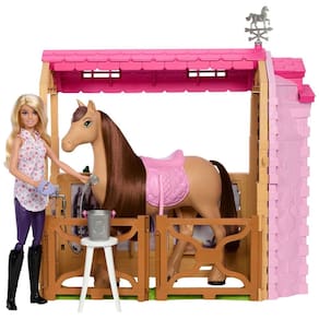 Inspirado na série Barbie Mysteries: The Great Horse Chase da Netflix, este conjunto de brinquedos Ultimate Stable de mais de 25 peças está cheio de diversão! Com seis áreas de brincadeira, as crianças podem ajudar a boneca Barbie a tratar seu cavalo de brinquedo com vegetais deliciosos no posto de alimentação, limpar e escovar seu cavalo na área de tosa, treinar na cerca de salto, pendurar fitas ou deslizar e trocar fotos na parede de troféus e cuidar do jardim com rosas plug 'n play.