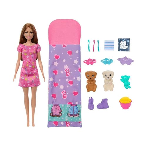 A Barbie está pronta para dar uma festa do pijama com cachorrinhos! Este conjunto inclui uma boneca Barbie, dois cachorrinhos adoráveis, um saco de dormir que serve para os três e 10 acessórios. Para uma diversão com mudança de cor, as crianças podem transformar o rosto do cachorrinho de limpo para macio usando água gelada e morna. Pronta para uma noite divertida em casa, a boneca Barbie veste um camisão e pantufas. Todos têm uma máscara de dormir para sonhos tranquilos! A boneca não fica em pé sozinha. As cores e decorações podem variar.