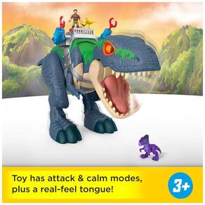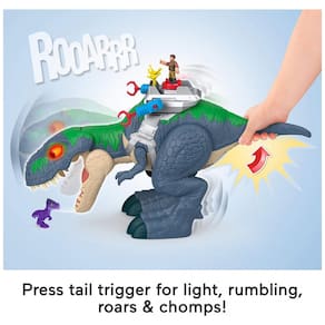 O playset Fisher-Price Imaginext Jurassic World Rebirth Ultimate Action Chomp T. rex apresenta um grande T. rex eletrônico com luzes, sons, movimentos e recursos de ação inspirados no filme Jurassic World Rebirth. O dinossauro mede aproximadamente 45,7 cm de altura e 76,2 cm de comprimento, oferecendo presença de destaque em brincadeiras de chão e cenários de aventura.?