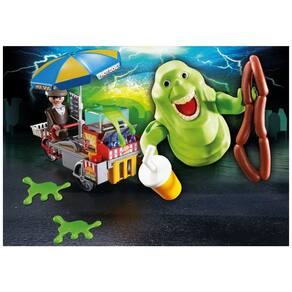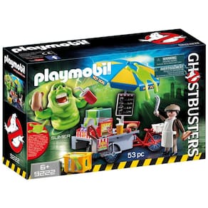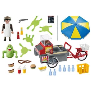 Conteúdo da caixa: Figura Slimer, figura de vendedor, carrinho de cachorro-quente, bicicleta, guarda-sol, peças de slime, alimentos e bebidas, placa de preços e acessórios diversos?
