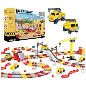 CONTEÚDO: Conjunto de construção Snap Trax 204 peças de pistas de corrida 2 caminhões de brinquedo LED com 3 acessórios trocáveis ??(requer 2 pilhas AA cada - não incluídas) 3 caminhões de construção 1 guindaste + 6 placas de construção 2 pontes, 12 túneis, 10 divisórias, 4 cones 2 arcos, 1 portão e 1 bola Trax 1 Manual de instruções