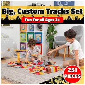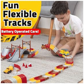 Este conjunto de pista de construção vem com 204 trilhos de corrida para montar, 2 caminhões de LED com 3 acessórios intercambiáveis, 3 caminhões de construção, 1 guindaste, 2 pontes, 12 túneis, 10 divisórias, 4 cones, 6 sinais de construção, 2 arcos, 1 portão e 1 haste de bola trax. É um kit de brinquedos STEM que ajuda a desenvolver habilidades de construção e engenharia em crianças, além de melhorar suas habilidades motoras. As peças móveis são realísticas, com um guindaste e 3 caminhões de construção que se movem. Os 2 caminhões de brinquedo LED são divertidos mesmo no escuro, mas requerem 2 pilhas AA cada, que não estão incluídas. As pistas de corrida flexíveis são fáceis de montar e desmontar, além de serem divertidas para crianças a partir de 3 anos.