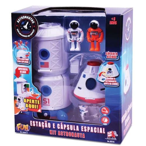 Para sua comodidade, este brinquedo será entregue embrulhado para presente sem custo adicional Kit Astronautas Estação Espacial e cápsula foi criada para dar mais conforto aos astronautas quando pousam em outros planetas. Internamente o local tem todos os instrumentos para uma exploração integral. Vem com a estação espacial, 1 cápsula e 02 astronautas. Possui luz, sons. Acompanha 2 pilas AA. O brinquedo é ideal para presente de aniversário, férias, dia das crianças e Natal, para meninos a partir de 3 anos de idade. Inmetro: CE -BRI/IQB 5170 NM 300/2002 OCP 0006 Ean: 7898039605906