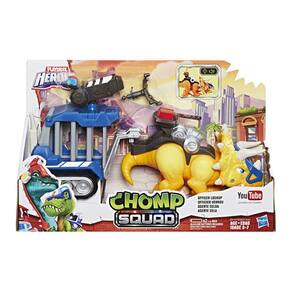 As figuras e playsets do Chomp Squad trazem o mundo dos dinossauros para os quartos das crianças! Imagine emergências hilárias e missões de resgate heróicas com essas divertidas figuras de dino e seus parceiros humanos. Pequenos aventureiros podem imaginar um mundo onde os dinossauros nunca foram extintos com a figura de Chomp Squad Officer Lockup e playset. As crianças podem imaginar que os encrenqueiros estão correndo soltos em Chomp Valley e mandam o oficial Lockup para manter a paz! O trailer removível também é compatível com a figura do Chomp Squad Raptor Compactor! (Figuras adicionais e playsets vendidos separadamente. Sujeito a disponibilidade.) Para ainda mais emoção dino pré-escolar, os pais podem procurar por episódios animados do Chomp Squad no YouTube em 2018! Os pré-escolares se deliciarão com as histórias engraçadas de aventuras e parcerias heróicas do Chomp Squad.