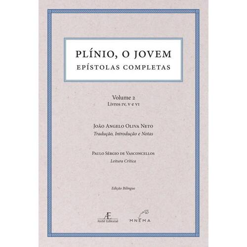 Plínio, o Jovem – Epístolas Completas Vol. 2 (Livros IV, V e VI) Damos continuidade neste volume 2 à empresa de publicar em português os quatro volumes de todo o epistolário de Plínio, o Jovem, em edição bilíngue e anotada, o que ocorre pela prime ira vez. Ainda que nas epístolas ocorram situações e personagens que sabemos ser importantes na administração de Roma, quem comparece no volume e apresenta elemento diferencial são eventos e personagens menores, mas não menos importantes, em geral au sentes daqueles gêneros e autores: vemos então o afeto que Plínio nutre pela jovem esposa, conhecemos um escravo doente, conhecemos um amigo que Plínio quer recomendar, lemos o elogio que faz de jovens no início da carreira, contemplamos a importânci a das recitações privadas e a atividade poética de Plínio, lemos o elogio de amigos, amigas e escritores bem como a demonstração de luto pela doença e morte de algum deles e ao lado de tudo isso (por que não dizer?) lemos muitos faits divers, como um caso de adultério, o suicídio de um casal de idosos e um dito cômico. A única exceção, porém notabilíssima, são as famosas “epístolas vesuvianas”, em que Plínio descreve a erupção do Vesúvio em 79 d.C. e a catástrofe que se abateu sobre Pompeia e ad jacências. As epístolas de Plínio não nos apresentam enfim apenas matéria diferente do que se lê na poesia e na historiografia, mas oferece-nos matéria complementar a elas. Coleção Clássicos Comentados Edição Bilíngue: Latim/Português Tradução, Introdução e Notas: João Angelo Oliva Neto Leitura Crítica: Paulo Sérgio de Vasconcellos Coedição: Editora Mnema