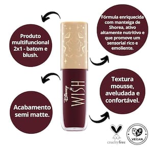 O Plush 2x1 Batom e Blush é um produto multifuncional. Apresentamos cores exclusivas e desenvolvidas através da paleta dos personagens de Disney Wish. Possui textura mousse, aveludada, extremamente confortável e acabamento semi matte.