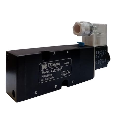 PN VS4M310.08 Válvula Solenoide Pneumática Namur 5/2 Vias Dn 1/4' Escolha a Voltagem: 110VAC Válvula Pneumática Serie 300 Tipo 5/2 vias acionamento pneumático Simples ação para Ar comprimido Corpo e contra corpo em Alumínio, Eixo e pistão em inox, Anel oring em Buna N Área efetiva de vazão: 30mm cv=1,68 ; Tamanho conexão Entrada e Sadia 1/4G escape 1/4 Pressão de Trabalho: Mínimo 1,15 bar Máximo 8,2 Bar ; Pressão maxima de teste 12 Bar Temperatura de trabalho: -20C 70C Válvula para uso em sistemas pneumáticos, utilizadas em automação, não tem solenoide o acionamento é pneumático. Utilizar Ar filtrado de 40 microns Marca: Não Informado