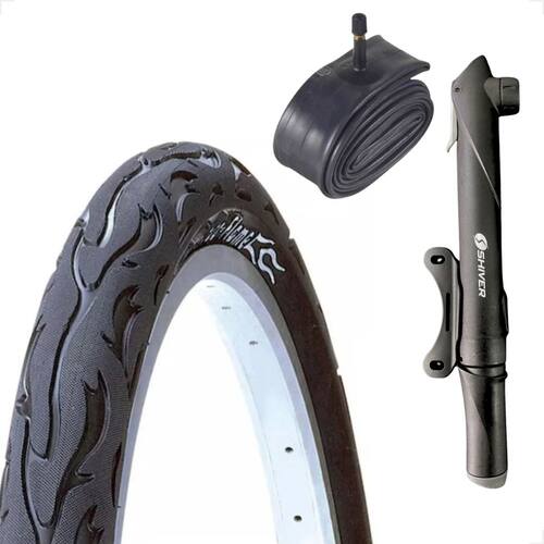 Itens inclusos: 1 unidade Pneu kenda Flame aro 26x2.125 1 unidade Camara de ar aro 26 SHIVER Bico grosso 33mm 1 unidade mini bomba de ar manual Shiver quadro
