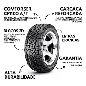 Tipo de veículo: Camionete Modelo: CF 1100 Largura: 265 Perfil: 60 Aro: 18 Medida: 265/60R18 Índice de carga: 114(1180Kg) Índice de velocidade: H(210km) Resistência ao rolamento: E Aderência em pista molhada: E Tipo de terreno: AT Desenho: Simetrico Treadwear:420 Tração: A Temperatura:B Tipo de construção: Radial Registro Inmetro: 008575/2014 Garantia: *5 anos, contra defeitos de fabricação*