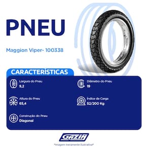 O Pneu Dianteiro Maggion Viper, possui aro 19, e se encaixa perfeitamente em motos, Crosser 150, Nxr Bross, Xre 300 e modelos similares. Você pode trabalhar, passear, viajar com máxima segurança. Os pneus diagonais são muito mais resistentes ao desgaste diário e suporte de peso. Assim, mesmo que a moto trafegue por locais ásperos e difíceis, a medida certa entre estabilidade ao motorista e conservação do pneu sob as melhores condições está aqui! O Winner suporta até 200 kg e conta com índice de velocidade 52.