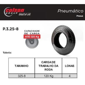 Com uma carga máxima de 120kg por pneu, esse produto é ideal para transportar cargas de diferentes tamanhos e pesos. Para um melhor desempenho, é recomendado o uso de uma câmara de ar com as medidas de 3.25 x 8.