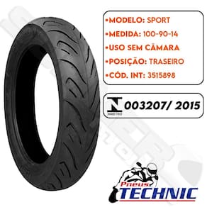 Descrição Técnica - Tipo: Pneu Novo Com Certificado INMETRO - Medida: 100-90-14 - Aro: 14 - Modelo: Sport - Fabricante: Technic - Índice de Carga: 57 - 230 kg - Índice de Velocidade: P - 150 km/h - Tipo de Uso: Uso Sem Câmara - Código INMETRO: 003207/ 2015 - Código Interno: 3515898
