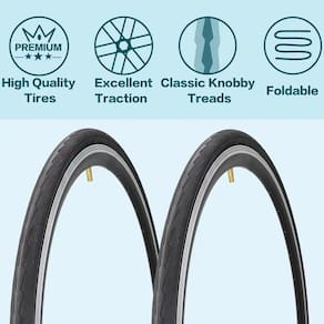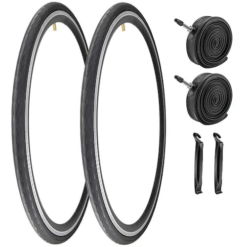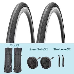 700 x 28C - Pacote: dois pacotes de pneus de bicicleta de estrada 60TPI 700X28C, tubo interno e alavancas de pneu - Tamanho: 700x28C. 60 TPI. Cor: preto. Adequado para bicicletas de estrada ou bicicletas de transporte - Este pneu de bicicleta de estrada usa uma estrutura de 60 tpi (um fio de menor diâmetro entrelaçado em uma trama apertada), tornando o pneu mais leve e flexível na estrada. Mais leve do que 30 pneus TPI - Pneus de bicicleta dobráveis A conta de aço carbono permite que os pneus sejam dobrados e fáceis de armazenar e transportar - Durabilidade: os tubos butílicos são altamente resistentes a perfurações e danos