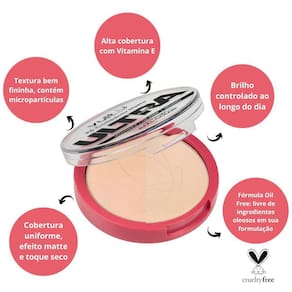 -cobertura média a alta. -efeito natural. -fórmula Oil Free: livre de ingredientes oleosos em sua formulação. -com Vitamina E. -aumenta a durabilidade da maquiagem. -vegano. -livre de parabenos. -brilho controlado ao longo do dia. -dermatologicamente testado.