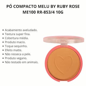 Pó Compacto Melu ME100Uma pele descomplicada, leve e com acabamento natural Esse sonho já é realidade.Benefícios-acabamento aveludado.-textura super fina. -cobertura média. -produto macio.-toque sequinho.-efeito matte.-não resseca a pele.-produto vegano.-não testado em animais..Modo de UsoAplicar sobre a pele com auxílio do pincel ou esponja.
