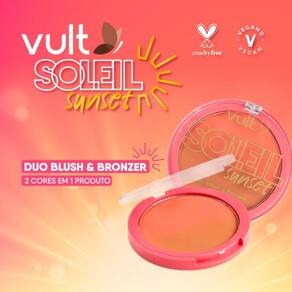 Pó Compacto Duo Blush e Bronzer Soleil Sunset 6g O Pó Compacto Duo Blush e Bronzer Soleil Sunset traz versatilidade para a sua make, em uma combinação de cores que é a cara do verão. Em edição limitada, esse item de maquiagem Vult da Coleção Soleil Sunset traz 2 cores em 1 produto: permite a construção de uma cor customizada em um degradê de cores que se mesclam de forma sofisticada e entregam uma cor única no look. Confira todos os benefícios: -Acabamento bronze incrível; -Garante um efeito aveludado e com uma textura leve; -Acabamento natural, que realça a maquiagem com cara de saúde; -Textura matte aveludada, leve e fácil de esfumar; -Possibilita a construção de camadas. Inspirados pelos tons únicos e expressivos do pôr do sol, Vult traz uma coleção de verão recheada de produtos que, assim como a Golden Hour (hora mágica/dourada), valorizam sua beleza natural! Nenhum produto Vult é testado em animais, ou seja, este item possui selo Cruelty Free. Produto vegano. Ingredientes Talco; Mica; Estearato de magnésio; Dióxido de silício; óxido de ferro vermelho; Palmitato de etilexila Amarelo de tartrazina; Óxido de ferro amarelo; Octildodecanol; Triglicerídeo caprílico/cáprico Corante vermelho 45410; Poli-isobutileno; Trietoxicaprililsilano; Amarelo crepúsculo; Óxido de ferro preto; Caprililglicol; Fenoxietanol; Corante vermelho 1580; Poliaciladipato-2 de bis-diglicerila Hexilenoglicol. Como Usar: Conselho de Aplicação Com o auxílio de um pincel, aplique o produto com movimentos circulares nas áreas do rosto que desejar. Reaplique sempre que sentir necessidade. Orientações ao consumidor: Não aplique em pele irritada ou lesionada. Descontinue o uso em caso de sensibilização. Manter fora do