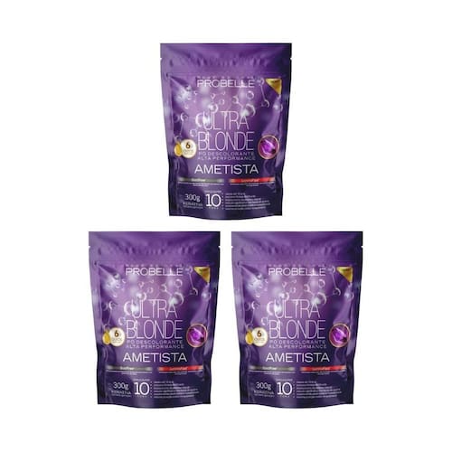 Em um recipiente não metálico, misture o pó descolorante probelle 300g ametista com o oxidante na volumagem adequada, até obter uma consistência homogênea. Aplique a mistura nos cabelos secos e não lavados, de acordo com a técnica escolhida. Deixe agir de 30 a 45 minutos, observando sempre o clareamento desejado. Enxágue abundantemente e prossiga com o tratamento adequado para cabelos descoloridos.