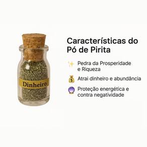 O Pó de Pedra Pirita Natural Ouro é um poderoso amuleto energético Conhecida como a Pedra da Fortuna, a pirita é associada à energia do sucesso, riqueza e crescimento material. Características do Produto - Produto: Pó de Pedra Pirita Natural Ouro - Origem: Natural - Energia: Prosperidade, sucesso e abundância - Uso recomendado: Amuletos, rituais, energizações e proteção Dica energética: Coloque um pouco do pó de pirita na carteira, no caixa da sua empresa ou no seu altar para atrair boas energias financeiras.