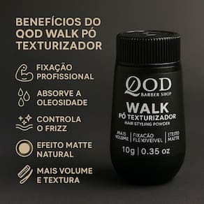 O pó texturizador walk da qod barbershop garante excelente fixação e acabamento profissional, ideal para quem busca volume e controle do frizz sem pesar nos fios. Sua fórmula absorve a oleosidade da raiz, proporcionando textura seca, efeito matte e estrutura duradoura para o penteado.
