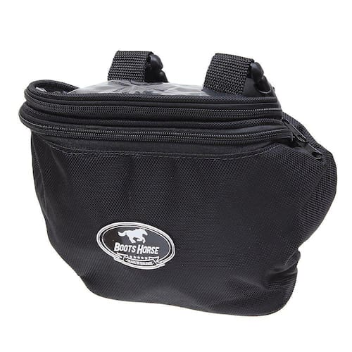 Pochete Boots Horse fabricada em nylon. Possui dois compartimentos com fechamento em zíper, sendo um transparente para celular e outro para utensílios em geral. Utilizada presa à cabeça da sela por duas correias de nylon com travas.