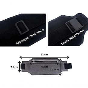 Ultra fina Tecido elástico Design podendo usar fone ou carregador portátil Zíper reivo Impermeável Não Risca o aparelho Zíper selado com PVC para não entrar água Forro da pochete impermeabilizado com PVC para não entrar água. Cinta em elástico Esportiva e discreta Cinto em elástico com fecho regulável no tamanho para ajustar ao corpo e as mais diversas de medidas de Silhuetas. Fecho em ABS Reforçado. e Pde.