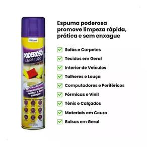 Poderoso Limpa Tudo Indicação: Espuma poderosa desenvolvida para a limpeza automotiva e doméstica em locais como partes internas do veículo, sofás, cortinas, carpetes, tecidos em geral, computadores, fórmicas, vinil, plástico, borrachas, tênis, sapatos, sandálias, bolsas, mochilas e couro. Modo de usar: Agite a embalagem e aplique o produto de maneira uniforme. A uma distância de aproximadamente 20 centímetros da superfície a ser limpa. Deixe o produto agir por 1 minuto. Esfregue se necessário. Retire o excesso e seque com um pano seco. Observação: Em tecidos ou outras superfícies a serem limpas que apresentem cor forte, fazer um teste de compatibilidade, pois poderá desbotar ou manchar. Observação: Em tecidos ou outras superfícies que apresentem cor forte, fazer um teste de compatibilidade, pois poderá desbotar ou manchar. Conteúdo: 1 embalagem de 300 ml