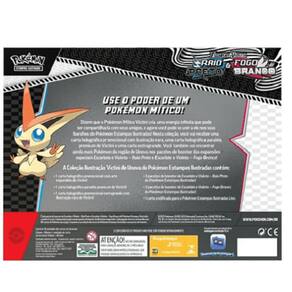 O Pokémon Mítico Victini, conhecido por gerar energia infinita e compartilhá-la com seus amigos, é o destaque desta coleção especial do Pokémon Estampas Ilustradas O conjunto inclui uma carta promocional com ilustração rara, uma carta holográfica paralela, uma carta holográfica premium de Victini e uma carta extragrande Além disso, a coleção traz pacotes de booster das expansões Escarlate e Violeta – Raio Preto e Escarlate e Violeta – Fogo Branco, com ainda mais Pokémon da região de Unova Ao todo, são 39 cartas no formato padrão de 63mm x 88mm e uma carta no formato especial de 133mm x 187mm