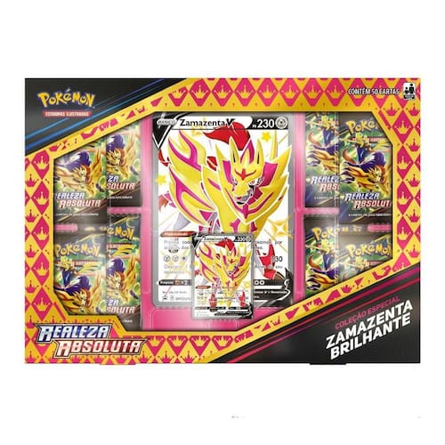 Pokémon Box Zacian e Zamazenta Brilhante - Copag A Espada Intrépida de Zacian V Brilhante! Pokémon Lendários Brilhantes estão entre os Pokémon mais cobiçados de todos, e agora você pode adicionar Zacian à sua coleção como um Pokémon V Brilhante em uma carta jogável e outra em tamanho extragrande! Com uma Habilidade que coloca Energia em jogo, Zacian V pode proporcionar uma vantagem inicial ao seu jogo, e suas cores incomuns irradiam a força da realeza em ciano e dourado. Você ainda encontrará um monte de pacotes de booster da expansão Realeza Absoluta para aumentar ainda mais a sua coleção! Selo Inmetro: CE-BRI/INNAC-00276-01A - NM300/2002 - OCP 0061 Ean: 0000001103106