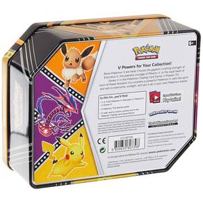 - A lata virá com um cartão de alumínio do Pokemon V apresentado na lata que você receber, Eternatus V, Pikachu V ou Eevee V