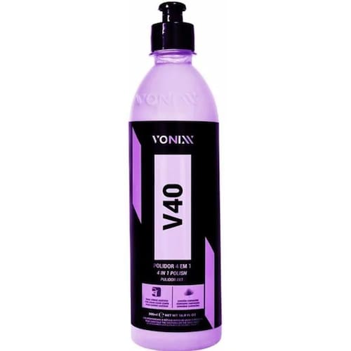 Polidor 4em1 v40 vonixx com carnaúba 500ml descrição: o polidor v40 - expertise science cumpre as 4 etapas do processo de polimento automotivo. Devido ao balanceamento perfeito de sua formulação a base de nano abrasivos, cera de carnaúba e solventes especiais, o v40 - expertise science promove corte, refino, lustro e proteção apenas trocando de boinas. Sua exclusiva fórmula promove um excelente acabamento, deixando um filme de cera de carnaúba altamente hidrofóbico, com reflexos perfeitos e admiráveis. Modo de usar corte: a superfície deverá está limpa e seca. Utilizando uma boina específica para este fim, com 5 a 6 gotas do produto, faça o polimento em uma área não superior a 60x60cm. Sob pressão moderada e velocidade entre 1000 e 1500rpm trabalhe a peça em várias passadas até observar o desaparecimento do produto. Caso necessário repita a operação. O excesso de produto poderá ser facilmente removido com uma toalha de microfibra. Refino: repita o mesmo processo efetuado na etapa de corte, trocando apenas a boina de corte, por uma boina de espuma de média agressividade específica para refino. Lustro: utilize de 2 a 3 gotas do produto usando uma boina de lustro, e efetue o polimento em uma área não superior a 60x60cm. Sob pressão moderada e velocidade de 1200rpm, continue trabalhando até observar o momento em que o produto começa a desaparecer da peça, nesse momento diminua gradativamente a rotação para 800rpm e a pressão de moderada para leve, vá observando o brilho, até que o produto desapareça por completo. Proteção: faça o acabamento final, usando uma toalha de microfibra vonixx limpa e seca até chegar ao resultado perfeito, observando um filme extremamente brilhante deixado pela carnaúba.