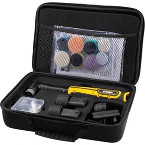 1 Politriz mini. Acompanha: 1 maleta, 2 baterias 12V - 2Ah íons de lítio, 1 fonte para carregamento 100 V~ a 240 V~ bivolt automática, 1 adaptador rotativo orbital, 1 adaptador roto-orbital leve, 1 adaptador roto-orbital pesado, 1 disco fixa fácil, 1 protetor do disco, 2 chaves especiais e 8 acessórios para polimento.