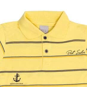 Com toque suave e fresquinho para uso diário ou ocasiões especiais, a camiseta polo na cor sol possuí mangas curtas, listras e fechamento de gola por botões, etiqueta termocolante e bordado pequeno de âncora com escrita "Escola náutica 1989, explorador do oceano, melhor marinheiro".