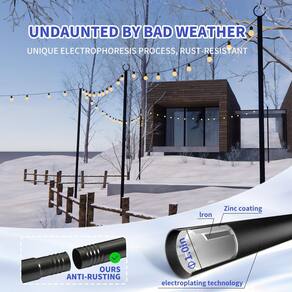 - Materiais premium à prova de ferrugem: Feito de metal de alta qualidade com um revestimento eletroforético, nossos postes de luz de corda oferecem durabilidade excepcional. Este tratamento de superfície avançado evita ferrugem, corrosão e desbotamento, não importa o clima: sol, chuva, vento ou neve