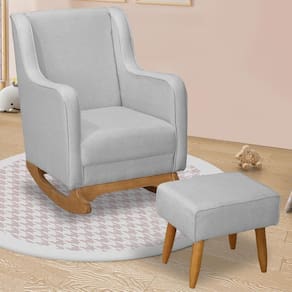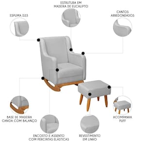 Com estrutura em madeira de eucalipto, oferece resistência e durabilidade no uso diário. A espuma D-23 combinada com o tecido linho da Poltrona proporciona um toque macio e agradável, excelente para longas períodos de amamentação. Seus pés de madeira contam com suporte estável e acabamento sofisticado, enquanto o mecanismo de balanço suaviza os movimentos, sendo perfeito para ninar o neném, promovendo relaxamento e bem-estar. O assento e o encosto são sustentados por percintas elásticas, garantindo firmeza e apoio adequados. O Puff incluso é ótimo para descansar os pés e aumentar ainda mais o conforto. Perfeita para quem busca praticidade e estilo, essa Poltrona de Amamentação se adapta facilmente a qualquer ambiente, seja no Quarto de bebê, na Sala de Estar ou em outros espaços, trazendo elegância e aconchego.