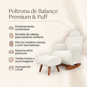 CARACTERÍSTICAS TÉCNICAS Modelo: Poltrona de Balanço Aurora com Puff Categoria: Poltrona Premium/Poltrona de Balanço Formato: Orgânico Cor: Off-White Estrutura interna: Madeira de alta resistência seca Base de balanço: Madeira maciça reforçada Estrutura do puff: Madeira maciça reforçada Espuma: D28 Premium Revestimento: Tecido Chenile Premium Encosto de cabeça: Integrado Assento: Amplo e ergonômico Puff: Incluso