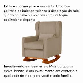 Perfeita para Amamentar, Descansar ou Relaxar. Seja no quarto do bebê, na sala ou no cantinho da leitura, essa poltrona é ideal para quem valoriza aconchego com estilo. O movimento de balanço suave ajuda acalmar seu bebê e também relaxa o corpo após um longo dia. A Maju se adapta com facilidade, proporcionando um toque de elegância e bem-estar em qualquer espaço.