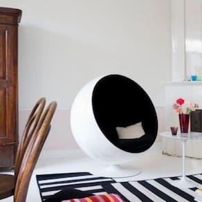 A Ball Chair, projetada por Eero Aarnio em 1963, é uma peça icônica do design moderno, reconhecida por sua forma distintiva e futurista. Também conhecida como Globe Chair, a poltrona foi concebida como um espaço íntimo e acolhedor dentro de um ambiente maior, oferecendo privacidade e conforto.