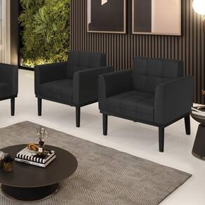 Você gosta de colecionar vários momentos memoráveis com sua família e amigos? Que tal recebê-los, com móveis de altíssima qualidade que só a D'Rossi tem? A Poltrona Elisa é adequada para você! Seu design retrô é a grande tendência do momento. Pode ser usada em diversos espaços da casa, em salas, hall de entrada, quartos, cozinhas, varanda, sacada, escritório, dentre outros. Contém as seguintes características: A estrutura é feita de madeira de Eucalipto 100% de reflorestamento, e a Base de Madeira Fixa Preto, além de ser resistente e durável, suporta em média até 120 kg. Assento, encosto e braços, contém enchimento de espuma D-23 e é estofada em tecido Corino, que oferece muito conforto e resistência ao sentar, com aquela sensação de maciez e aconchego. Possui também, detalhes de costura no encosto e assento, resultando em um acabamento impecável, conferindo muito mais valor e elegância ao seu espaço. Para complementar a decoração com essa linda poltrona, a dica é utilizar mantas, almofadas ou vasinho de flor. E pronto, seu cantinho estará perfeito para descansar e relaxar! Aqui, você encontra várias opções, para que seus amigos e familiares se sintam acolhidos. Garanta já seu Kit 2 Poltronas..