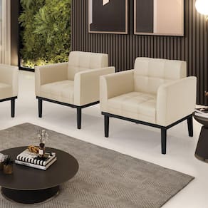 Você gosta de colecionar vários momentos memoráveis com sua família e amigos? Que tal recebê-los, com móveis de altíssima qualidade que só a D'Rossi tem? A Poltrona Elisa é adequada para você! Seu design retrô é a grande tendência do momento. Pode ser usada em diversos espaços da casa, em salas, hall de entrada, quartos, cozinhas, varanda, sacada, escritório, dentre outros. Contém as seguintes características: A estrutura é feita de madeira de Eucalipto 100% de reflorestamento, e a Base de Madeira Fixa Preto, além de ser resistente e durável, suporta em média até 120 kg. Assento, encosto e braços, contém enchimento de espuma D-23 e é estofada em tecido Corino, que oferece muito conforto e resistência ao sentar, com aquela sensação de maciez e aconchego. Possui também, detalhes de costura no encosto e assento, resultando em um acabamento impecável, conferindo muito mais valor e elegância ao seu espaço. Para complementar a decoração com essa linda poltrona, a dica é utilizar mantas, almofadas ou vasinho de flor. E pronto, seu cantinho estará perfeito para descansar e relaxar! Aqui, você encontra várias opções, para que seus amigos e familiares se sintam acolhidos. Garanta já seu Kit 2 Poltronas..