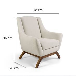 Estrutura fabricada com madeiras de eucalipto tratado, MDF e OSB unidas com grampos galvanizados. Percintas elásticas de nylon e espumas certificadas fazem o produto suportar pesos de até 120 quilos. Revestimentos com costura rebatida que possuem maior resistência a abertura de costuras. Acompanha Almofadas extras: Não Acompanha Puff: Não Almofada do assento: Não Possui Almofada do encosto: Não Possui Altura do assento até o chão: 47 cm Altura do Encosto: 61 cm Ambiente Principal: Sala de Estar Cor: Bege Cor do Produto: Bege Design Assinado: Não Enchimento do Braço: Espuma D-23 Encosto para a Cabeça: Não Estampado: Não Extensível: Não Itens Inclusos: 1 Poltrona Marca: Domi Material do Braço: Madeira / Espuma / Tecido Material dos Pés: Madeira Modelo de Poltrona: Fixo Necessita Montagem: Não Origem do Produto: Nacional Peso: 28 kg Possui Percintas Elásticas: Não Possui Pés: 04 Possui Rodízio: Não Recomendações de Uso, Manutenção e Limpeza: Adequado para uso residencial, sua conservação/limpeza deve ser feita através de pano úmido sem esfregar. Suporta Até (kg): 120 kg Tecido Predominante: Linho Tipo de Assento: Fixo Tipo de Encosto: Fixo Tipo de Poltrona: Decorativa