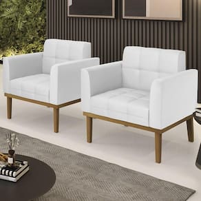 A Poltrona Decorativa é revestida em sintético, que é durável e fácil de limpar, e ainda valoriza o design da poltrona. Os braços e encosto são confortáveis em espuma D-18, já o assento é com espuma D-26 de alta densidade, que garante um assento firme e aconchegante, ideal para relaxar após um dia cansativo. A base em madeira de eucalipto é um charme à parte, que confere um toque Rústico e sofisticado à peça. São 2 poltronas com estrutura resistente que suporta até 120 kg cada. A montagem é muito simples, pois a poltrona já vem pronta, bastando apenas fixar a base com os parafusos que acompanham o produto. A limpeza também é muito prática, pois basta utilizar um pano limpo e levemente úmido, sem produtos abrasivos, para manter a sua poltrona sempre em bom estado. Sem dúvidas a Poltrona Para Sala vai transformar seu ambiente, deixando mais confortável e estiloso!